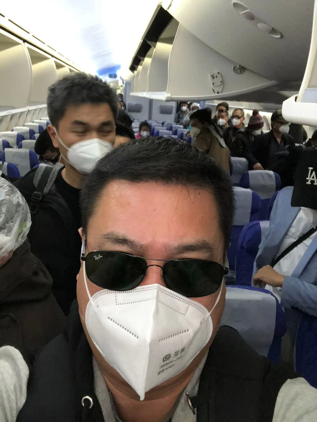 上飞机前,所有人要测一次体温,四个人一组,测一个上一个,算上进机场和过安检测的两次,这已经是当天第三次测体温了。测完后,每人领到一个N95口罩,之前戴的全都要换下来扔掉。