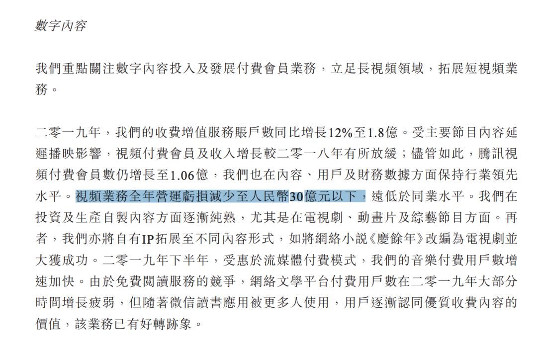 但是这不是文娱商业观察的重点,本次财报首次披露了腾讯视频的重磅信息:2019年全年营运亏损控制在30亿元以下,会员人数已达1.06亿元,虽然付费会员信息经常披露,但是经营亏损等核心数据,还是腾讯视频第一次公布。