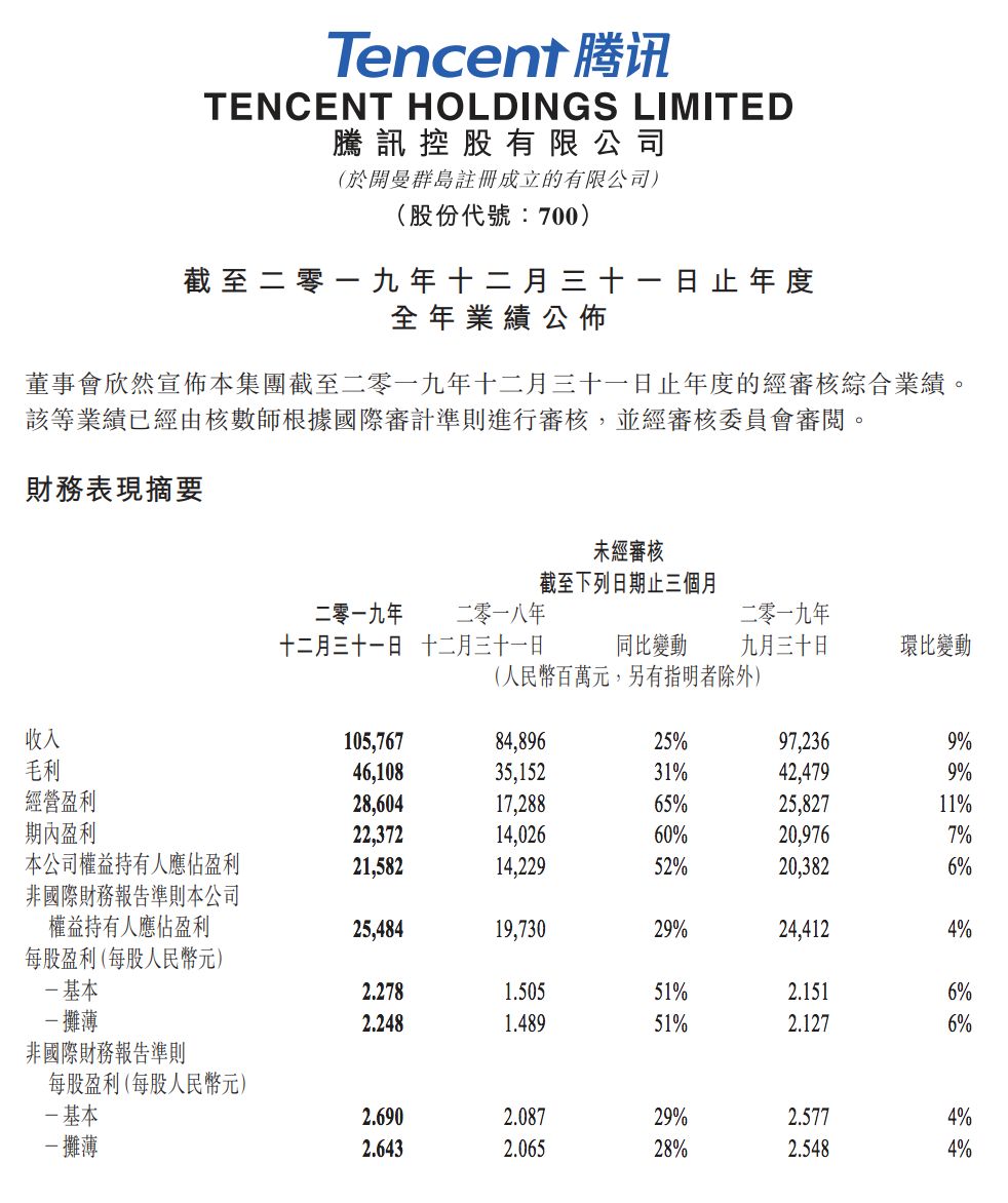 A股茅台、港股腾讯、美股苹果,传说中的各股市定海神针级别的公司中,腾讯率先公布了其2019年年报。