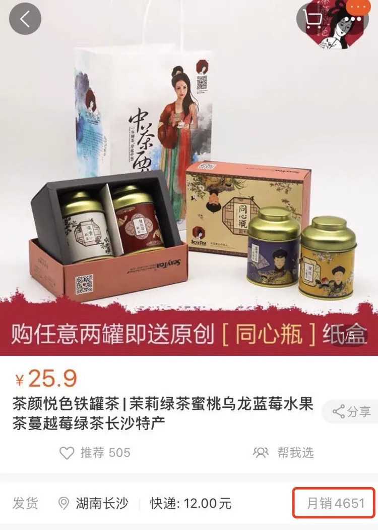从目前的数据来看,销量最高的铁罐茶,单价25.9元/罐,有5种茶叶种类可供选择,月销4652笔。