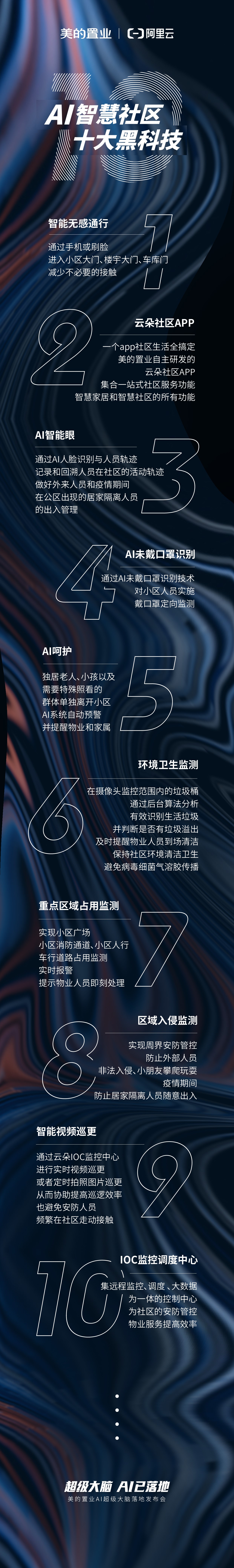 上述充满科技感的场景,在3月19日“超级大脑,AI已落地”美的置业AI智慧社区落地线上发布会上亮相。美的置业联合阿里云重磅发布首个AI社区大脑,通过IoT、云计算、人工智能、大数据等技术,实现社区智能化与家居智能化的真正打通以及全屋智慧健康场景的落地,解锁健康智慧人居新生活。以首个AI社区为契机,美的置业从2020年起所有新拿地项目都将具备AI社区功能,做真正能交付业主的智慧社区。