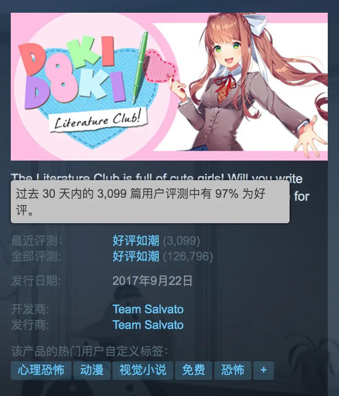 诚然,《心跳文学部》是一款小品级独立游戏,但它的履历相当亮眼:在Steam平台超过12万的游戏评测中获得97%的好评;2017年斩获IGN玩家票选最佳PC游戏、玩家票选最佳冒险游戏两个重量奖项,还得到了最佳游戏创意和最佳剧情奖。顺便,游戏女主角的推特也有了34万粉丝……听上去很厉害不是么?