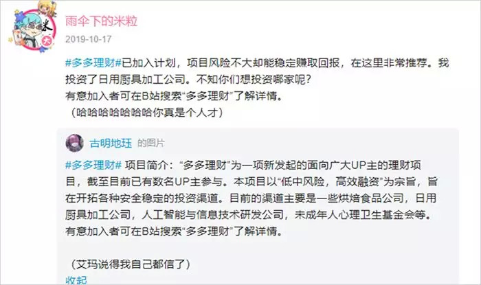 照理说,“多多理财”这个惹了一身腥味的名字应该就此被扔进历史的垃圾堆,但事实并不是这样——也是在2019年10月,有这么一群B站Up主捡起了这个被丢弃的马甲,认真穿戴了起来。