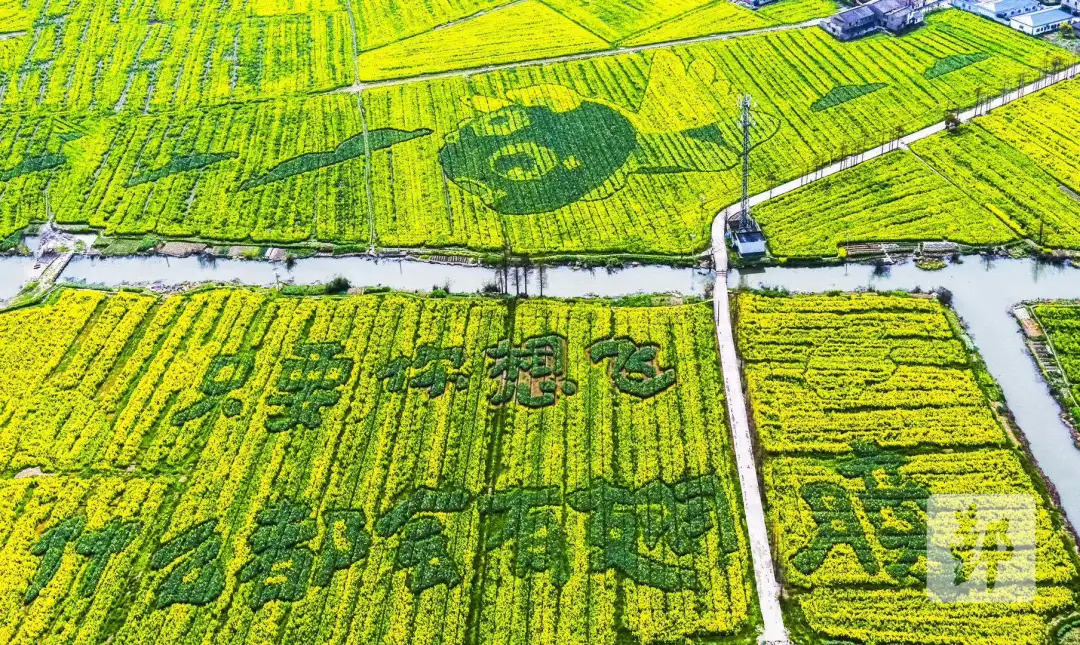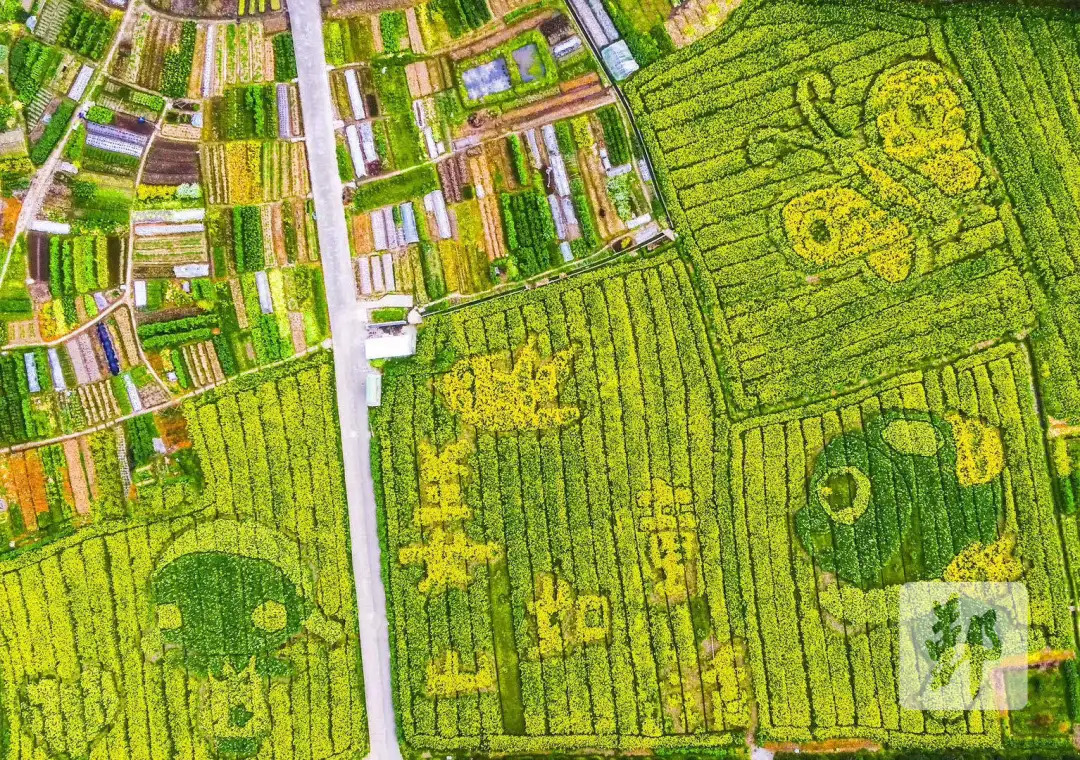 今年姜山镇首次试种彩色油菜花,通过色彩的搭配,在大地上描绘出了一组组的卡通画面,蝴蝶、小熊、鲜花……边上是彩色油菜花书写的“姜山如童话”。