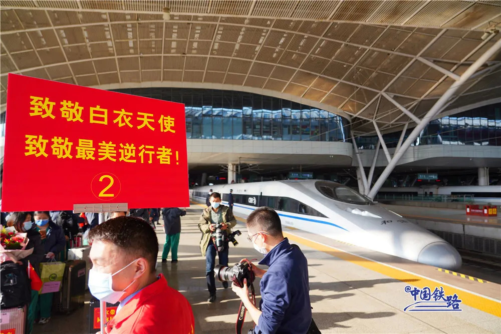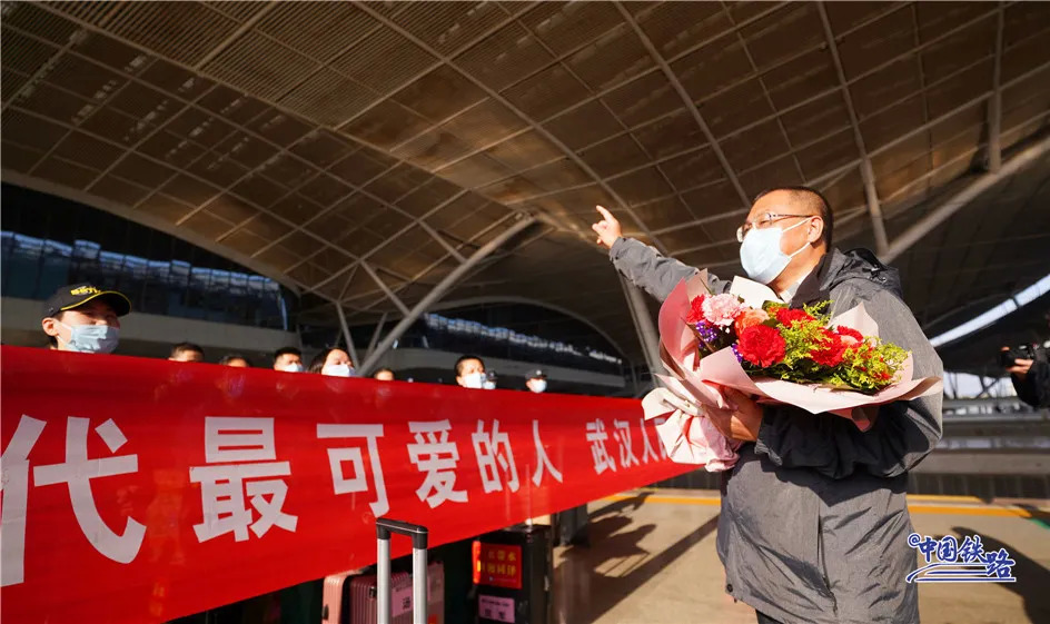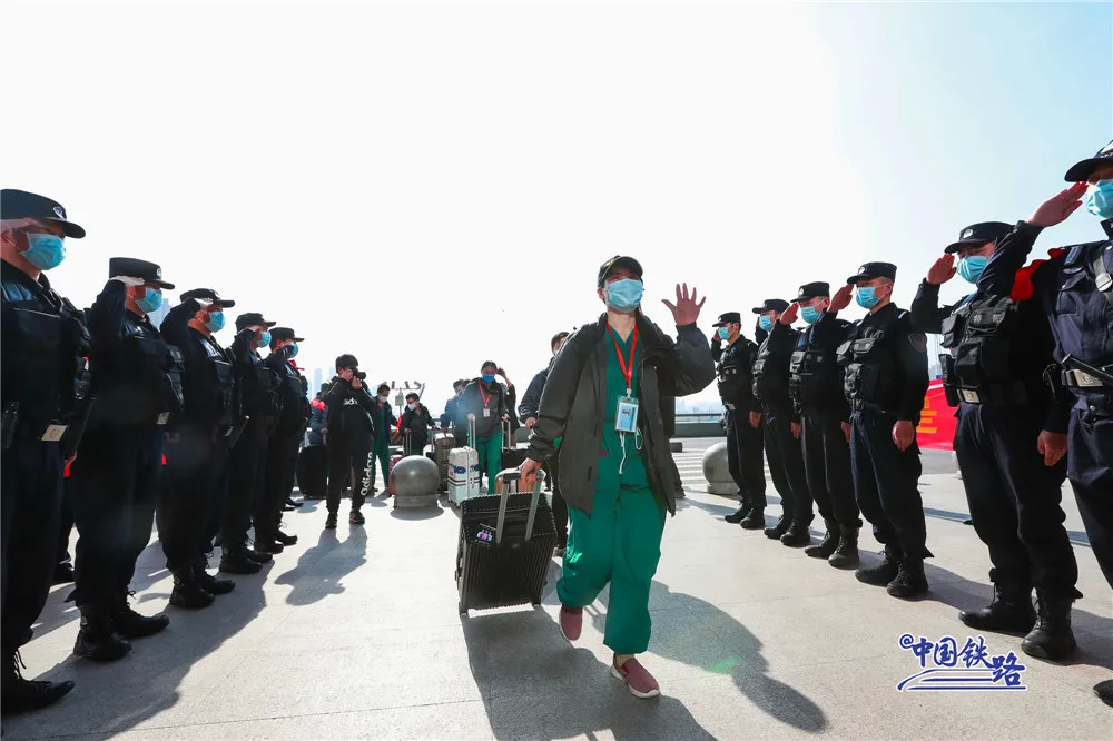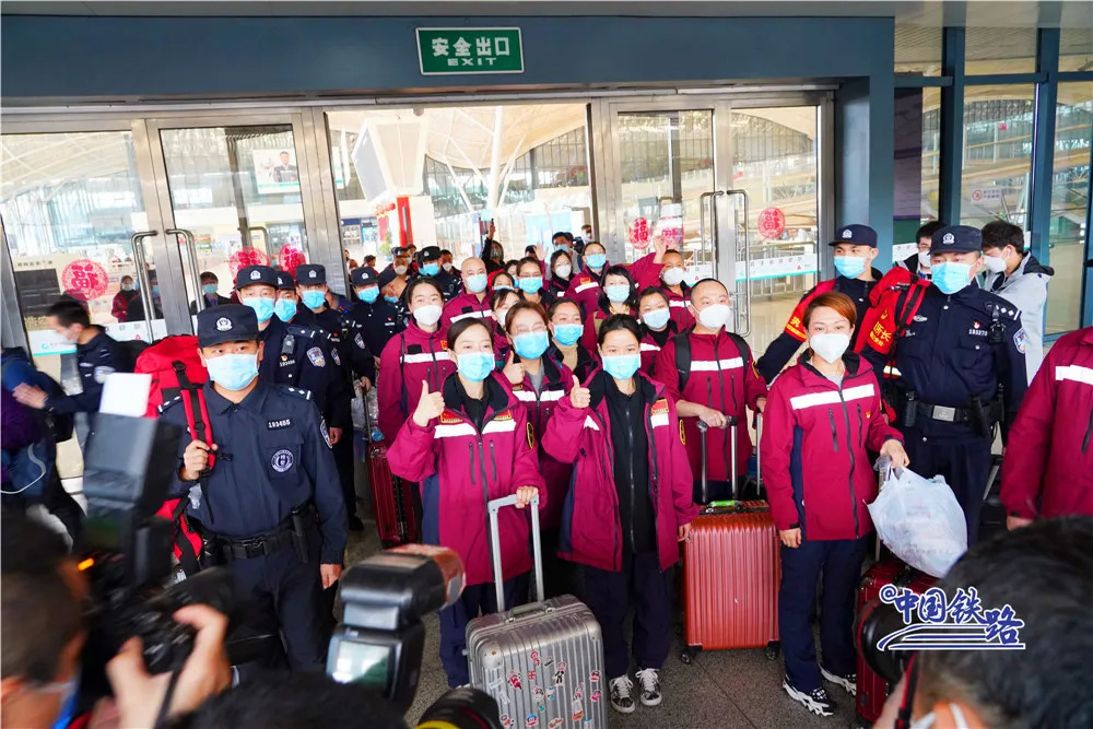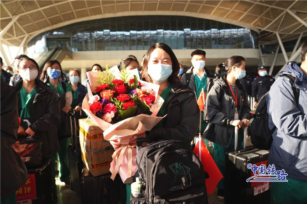 与此同时,铁路民警、车站工作人员和志愿者们在进站口列队迎接。候车室里、站台上……大家用鲜花和掌声向最美丽的“白衣天使”致敬。
