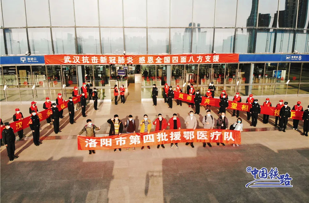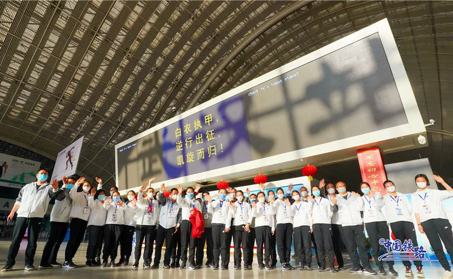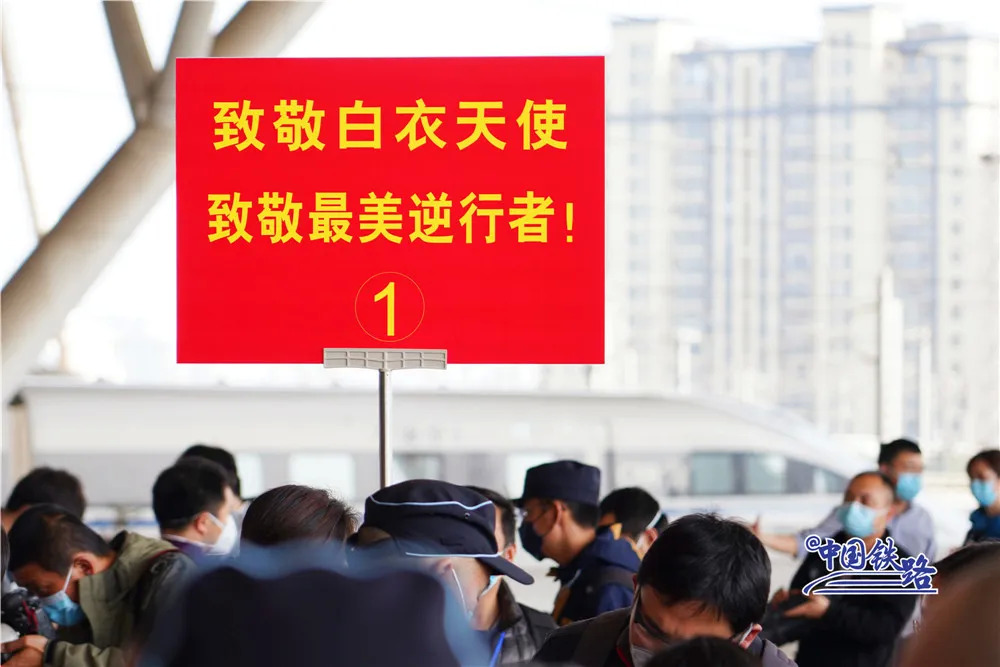 武汉站进站大厅的电子屏幕上滚动显示着欢送标语:“白衣执甲,逆行出征,凯旋而归!”“向奋斗在抗疫一线的广大医务工作者表示崇高的敬意!”“你们是新时代最可爱的人,武汉人民永远铭记您!”