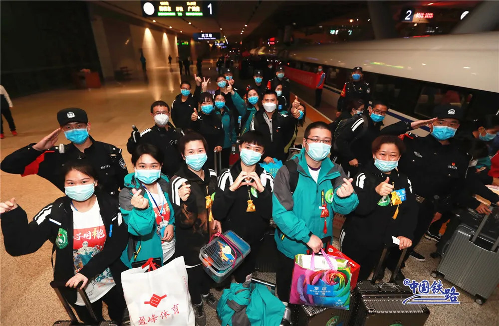 3月17日15时18分,来自贵州和湖南的援鄂医疗队一行90人在武汉站1站台登上G405次列车,这是首批乘坐高铁返程的援鄂医疗队。