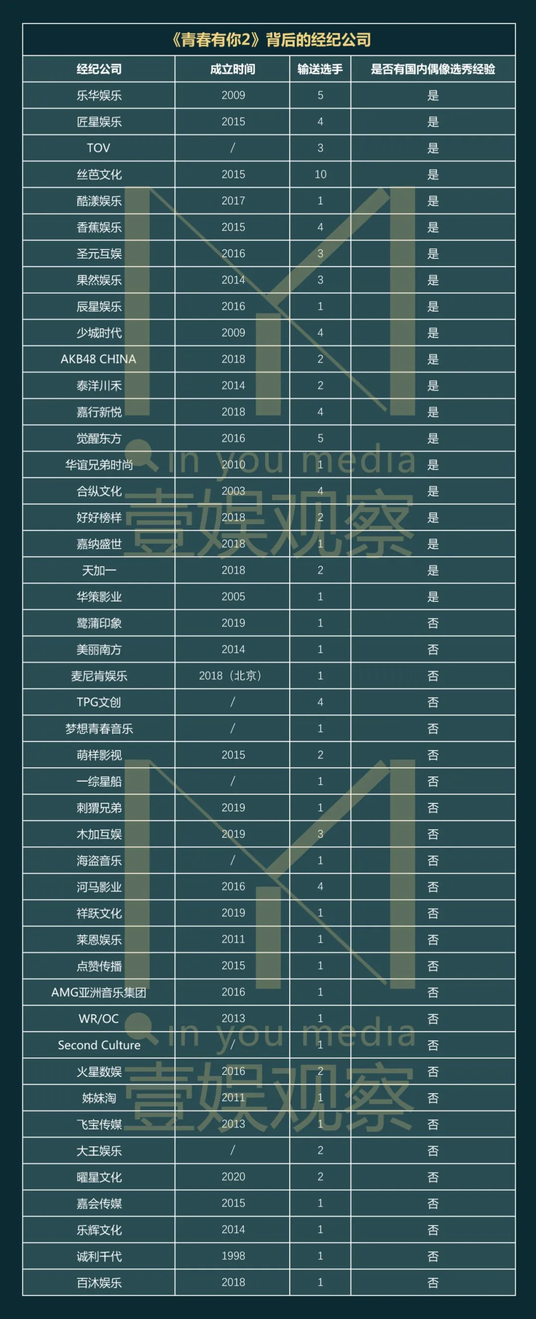 除此以外,新玩家占据了此次《青你2》的半壁江山,其中包括知名演员和制作人领衔的影视公司(包贝尔的河马影业、柴智屏的萌样影视)、从事网红孵化的机构(林小宅的点赞传播等)、大型音乐活动的运营机构(美丽南方等)、慕名而来的海外闯入者(麦尼肯娱乐等)以及爱奇艺自身旗下的厂牌(刺猬兄弟等)。