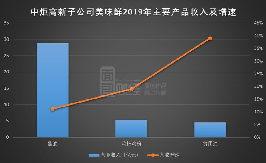 其中,酱油2019年的销售收入为28.8亿元,同比增长11.23%,营收占比65%;鸡精鸡粉的销售收入为5.27亿元,同比增长18.99%,营收占比12%;食用油的销售收入为4.47亿元,同比增长39.02%,营收占比10%;其他调味品的销售收入约占营业收入的13%。