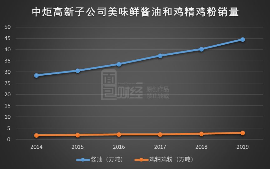 经营数据显示,美味鲜2019年整体生产量约60.3万吨,销售约61万吨。具体来看,酱油销量达到44.54万吨,同比增长10.83%;鸡精鸡粉销量为2.91万吨,同比增长19.2%;食用油销量为3.87万吨,同比增长38.67%。