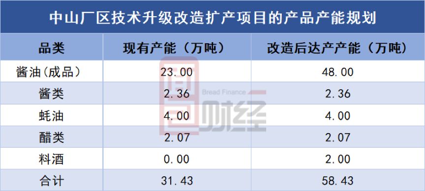 项目完成后,预计中山厂区年产各类调味品的产能将由31.43万吨提升至58.43万吨,其中,酱油产能新增25万吨,料酒产能新增2万吨。