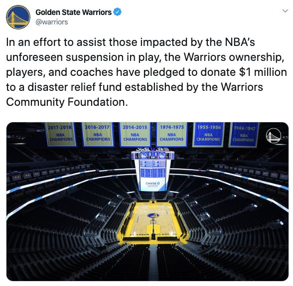 詹姆斯的「I Promise」学校虽然也不得不停课,但包括食物、水以及学习物资的资源中心仍对外开放;库班也为遭受重大打击的中小企业,提供咖啡和餐食;林书豪更是直接向联合国儿童基金会捐款15万美元。