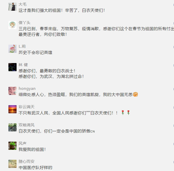 暖心和感动自不必说,最想说的是平安回家就好!武汉人加油,再次见面决不允许是这种方式!全国人民感谢医护天使们,也感谢英雄的武汉人民,谢谢你们的担当。