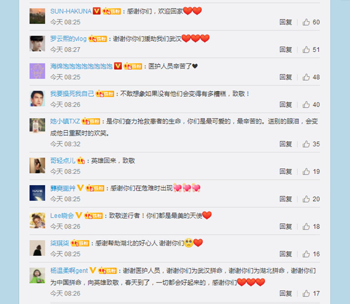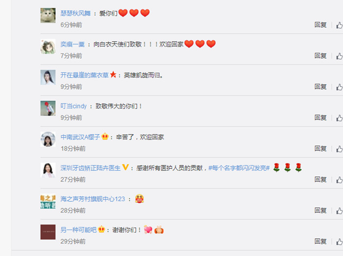 感谢你们的付出!你们是我心中的英雄!向你们致敬!每次看到你们的视频,我都感觉好温暖!回家好好休息和家人团聚!辛苦了!再次致敬这个时代的英雄们!