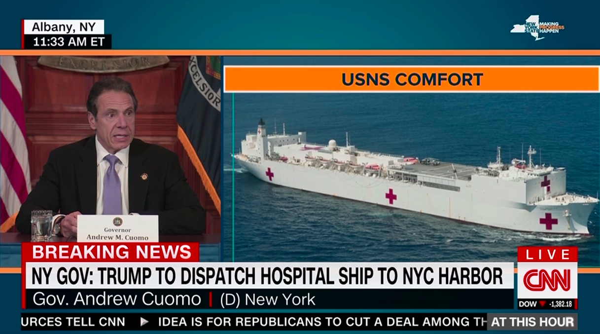 国防部部长埃斯珀周三在白宫表示:“正如总统所说,我已指示‘漂浮医院’舒适号(Comfort)和仁慈号(Mercy)军舰开始部署,以增加国家的医疗能力。我们也提醒各种野战和远征医院做好部署准备,并根据需要进行支援。”