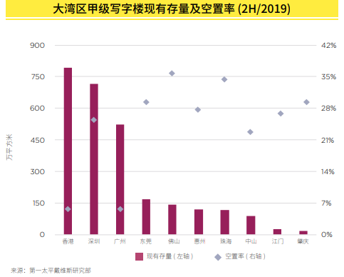 据第一太平戴维斯,2019年下半年,大湾区十一城甲级写字楼市场新增供应共计达140万平方米,其中深圳为主要的新增供应来源,占区域总新增供应的75.4%。供应压力叠加疫情影响致大湾区七城处下降初期,疫情已促使部分业主为租户提供免租期或直接减租,以帮助减缓其疫情期间经营状况所带来的压力。