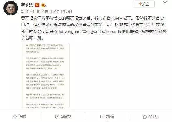 “虽然我不适合卖口红,但相信能在很多商品的品类里做到带货一哥。……初期我们团队的选品会侧重于:1.具有创新特性的数码科技产品,2.优秀文创产品,3.图书,4.具有设计感和实用性的家居杂货。中间再穿插一些性价比奇高的日用百货和零食小吃。”昨日下午四点,老罗(罗永浩)宣布了自己的直播电商入行决定和选品标准。昨日晚10点,他更新了情况:“已收到上千封合作邮件。”