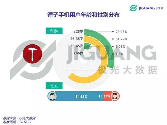 首先从用户层面来看,假定锤子手机用户和罗永浩粉丝有着相当的重合度,从极光大数据2019年发布的《2018年锤子手机市场表现及用户群体洞察分析》来看:锤子手机用户中男性用户占比高达84.63%,女性用户占比15.37%;有29.93%的锤子手机用户年龄在25岁及以下,26-35岁用户的占比达到61.72%;用户有16.66%分布在一线城市,新一线和二线城市的用户占比分别为24.97%和18.88%,二线及以上城市的用户占比合共达到60.51%。其中用户占比最高的城市依次为北京(6.24%)、上海(4.49%)和成都(3.3%)。