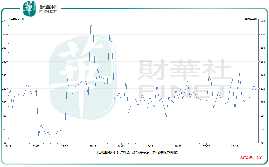 且从Wind数据看,生活纸类用品2018年出口25.69万吨,比2017年26.33万吨还小幅下降。虽然2019年前两月数据尚未出现,但受疫情影响,估计与海关数据大致相符。