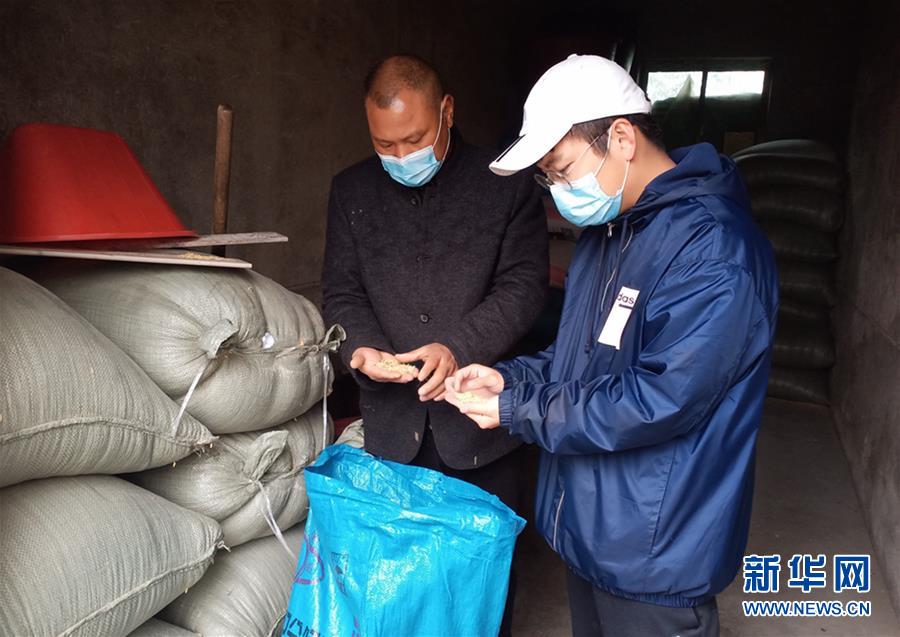 在湖南省益阳市赫山区八字哨镇高粱坪村,湖南农业大学在读研究生祝海竣(右)和农民查看种子(3月4日摄)。新华社发
