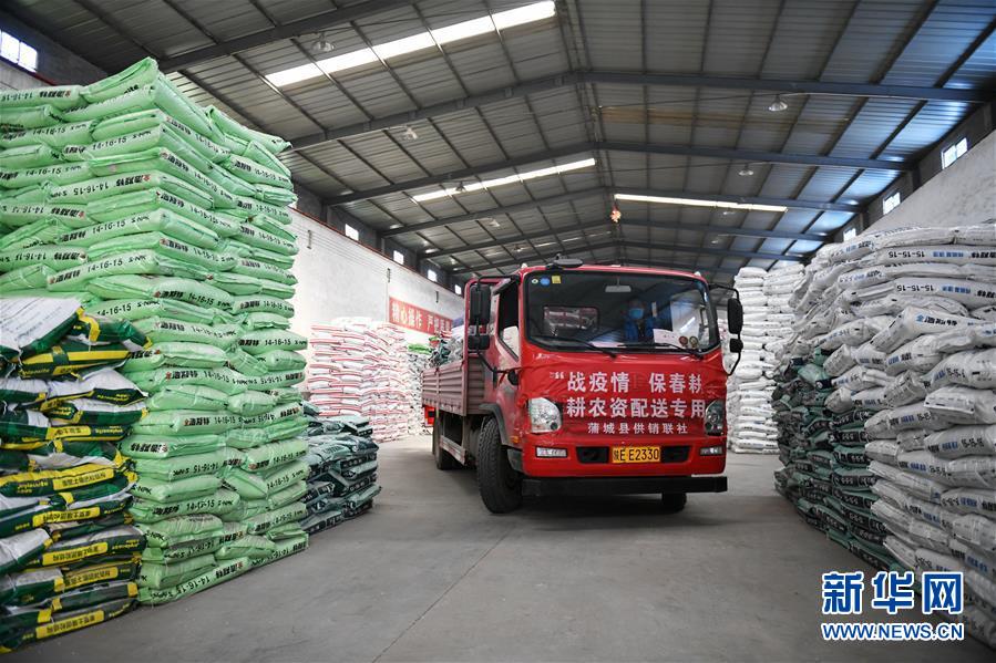 3月4日,陕西省蒲城县供销联社的配送专用车在一间农资仓库装运肥料。新华社记者 李一博 摄