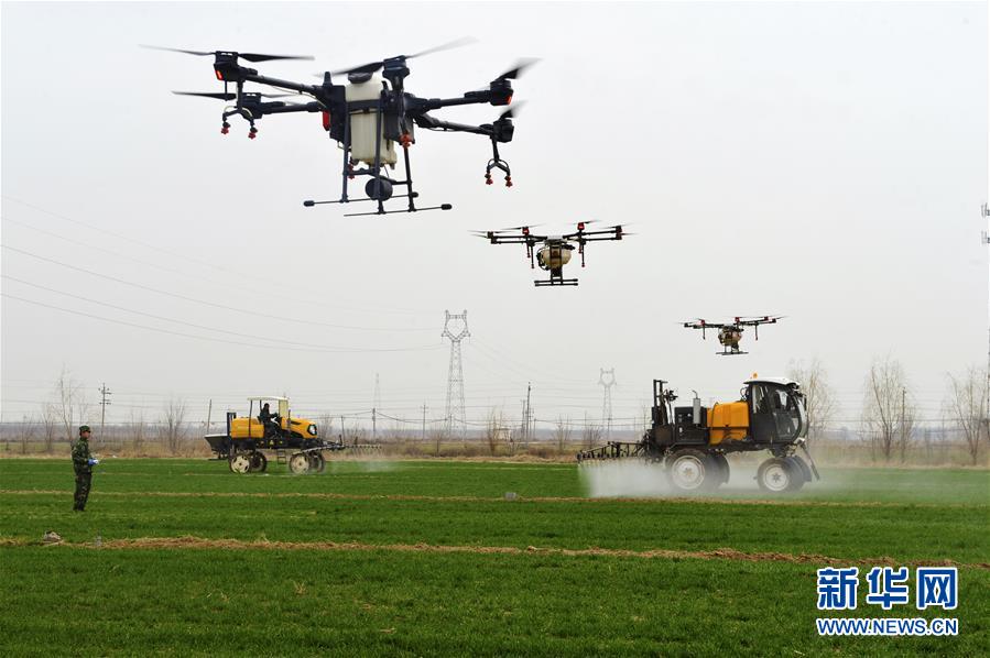 在河北省泊头市四营乡黄屯村麦田内,合作社工作人员利用植保无人机和喷雾机作业(3月12日摄)。新华社记者 牟宇 摄