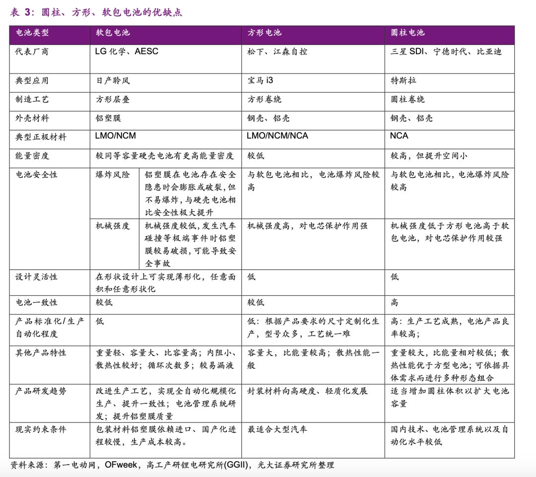 事实上,无论是方形锂电池、圆形锂电池还是软包电池,在车辆安全防护上也基本一致。因为目前三类电池内部组成(正极、负极、隔膜、电解液)与方形、圆柱锂电池的区别不大,最大的不同之处在于软包电池采用铝塑复合膜作为外壳,方形和圆柱电池采用金属材料作为外壳。