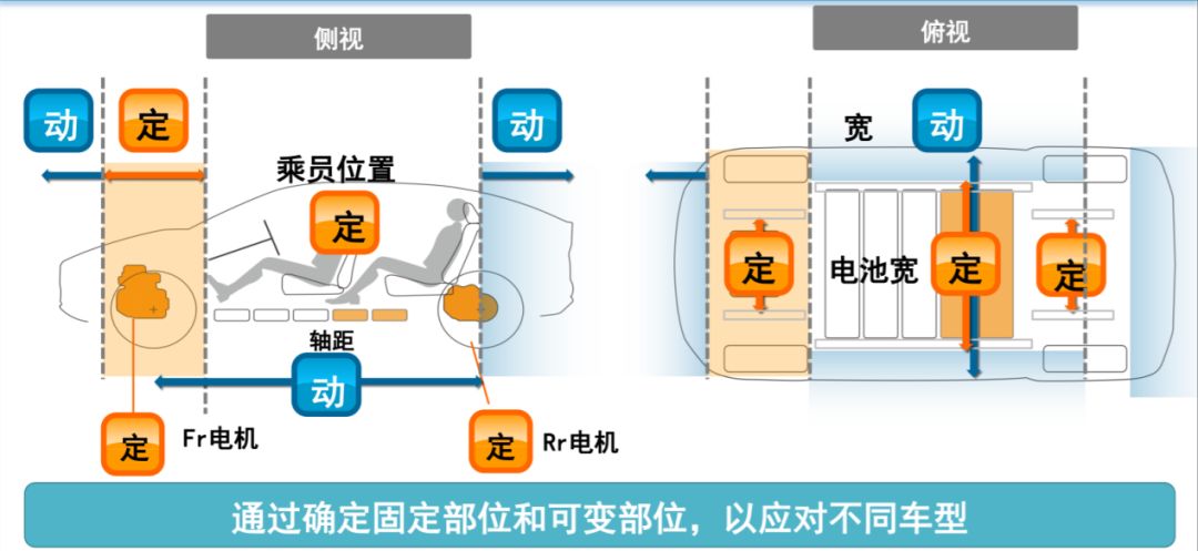 在这个固定「传统发动机舱」,其他位置皆可动态调整的模块化平台设计里,我们很容易发现,汽车的长度、轴距甚至于宽度都可以随意更改,但唯独对电池容量和体积有着严格的规划——固定电池宽度,仅增加电池长度增加电池电量。这样设计的目的何在?