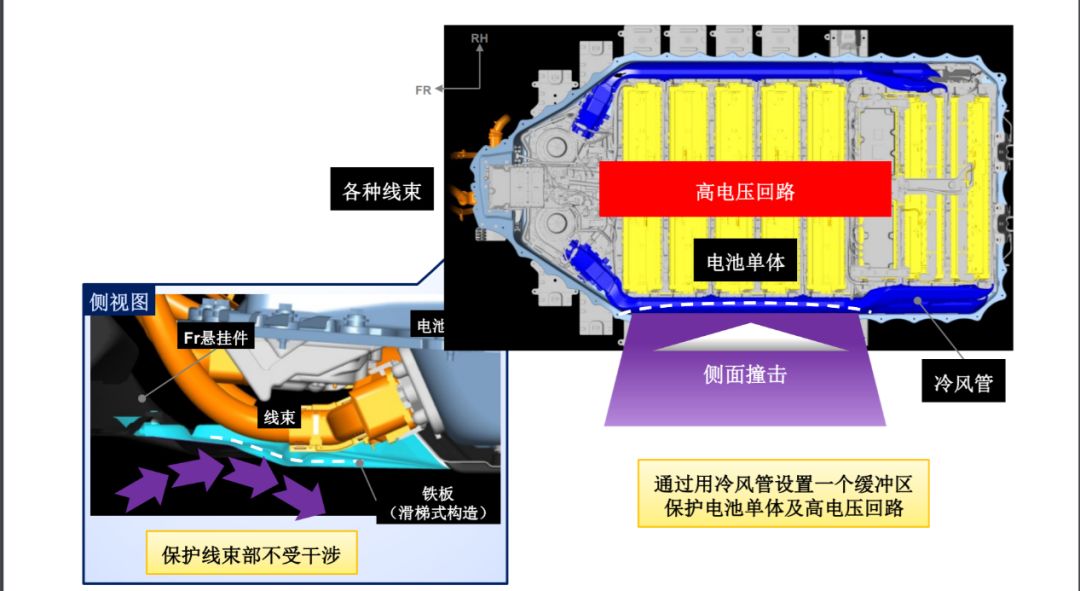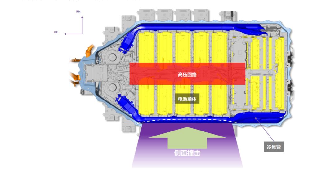 在正面冲击和追尾事故中,车辆拥有发动机舱和尾箱两块缓冲区域,使得常规正面碰撞事故不容易伤及电池,而侧面撞击因缓冲区域较小,则电池有较大几率受损,通过固定电池宽度,但不固定车辆宽度,丰田便可以在侧面用冷风管设置一个缓冲区域保护电池单体和高压回路。