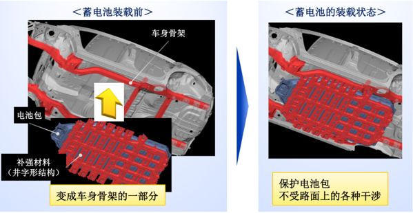 在设计车辆车身结构时就将电池考虑进去,在底部预留好充足的位置,提前考虑车辆刚性对电池部位的保护作用。在电池底部又重新设计一块井字形结构的补强材料护板,保护电池包不受路面上的各种干涉。这样的结果就是,大容量的电池包得以安装在车辆中央的下方,在确保宽敞的车内空间的同时,对车辆的低重心化、运动性能的提高也有帮助。