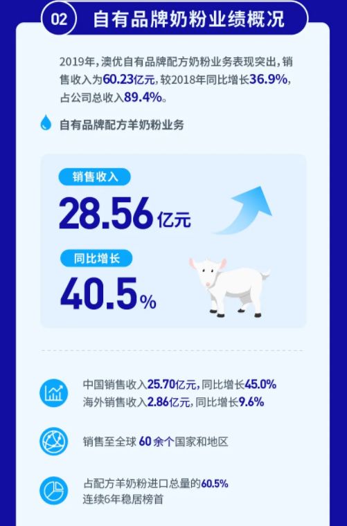 但就净利润增速来看,澳优以56.75亿元,同比增长14.13%遥遥领先于新乳业的2.44亿元,同比增长0.34%。并且据悉,2019年佳贝艾特销售量占全国进口羊奶粉销售总量的60.5%,实现中国境内销售额同比增长约45.0%至25.70亿元。在财报中,佳贝艾特配方羊奶粉贡献营收虽不及牛奶粉,但增速高达40.5%。