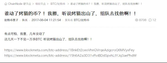2017年8月左右,也就是Bitcoin Cash诞生前后,比特币网络内几笔累计约17597 BTC的大额转账引起了社区的关注。按照当时的价格换算,这几笔共计折合人民币超3亿元的交易皆源自中国矿圈第一人烤猫的比特币地址。本来领域大佬的大额资金转移并不是什么新鲜事;但是这次的主人公不同,因为烤猫在2015年莫名其妙地消失了,且至今仍旧下落不明。