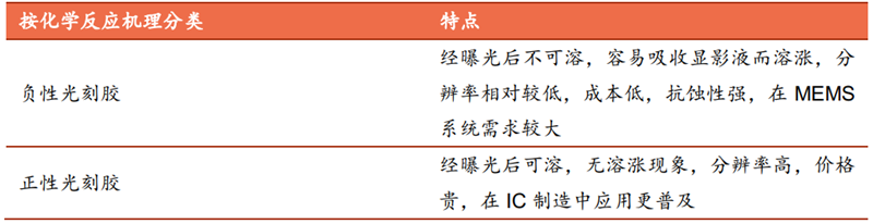 根据化学反应机理和显影原理的不同,光刻胶可以分为负性胶和正性胶。对某些溶剂可溶,但经曝光后形成不可溶物质的是负性胶;反之,对某些溶剂不可溶,经曝光后变成可溶的为正性胶。