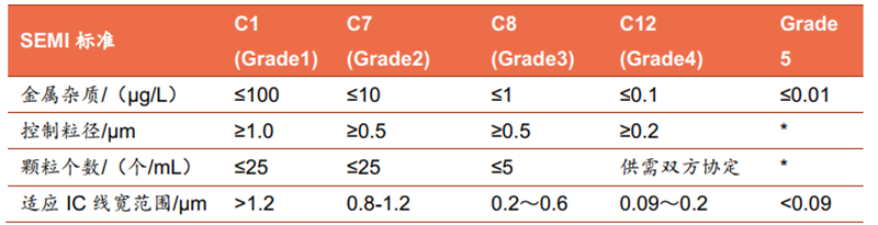 为了适应电子信息产业微处理工艺技术水平不断提高的趋势,并规范世界超净高纯试剂的标准,国际半导体设备与材料组织(SEMI)将超净高纯试剂按金属杂质、控制粒径、颗粒个数和应用范围等指标制定国际等级分类标准。