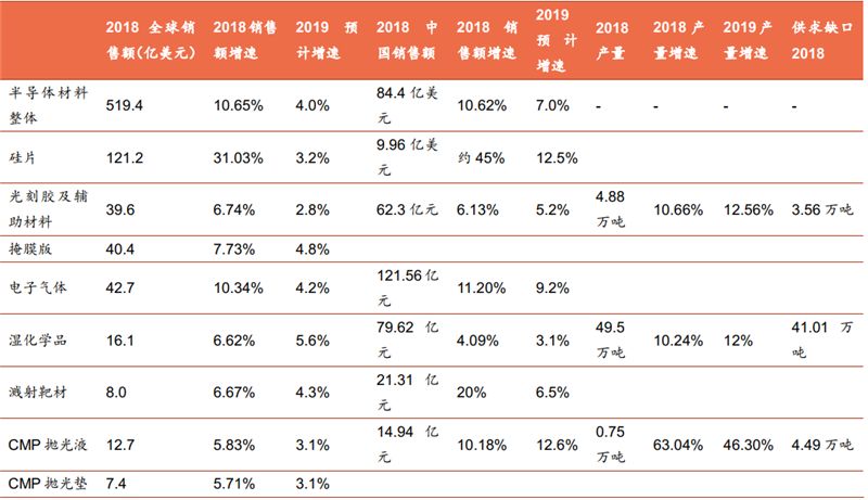 2018 年全球半导体材料销售额 519.4 亿美元,销售额首次突破 500 亿美元创下历史新高。2018 年全球半导体材料销售增速 10.65%,也创下自 2011 年以来的新高。