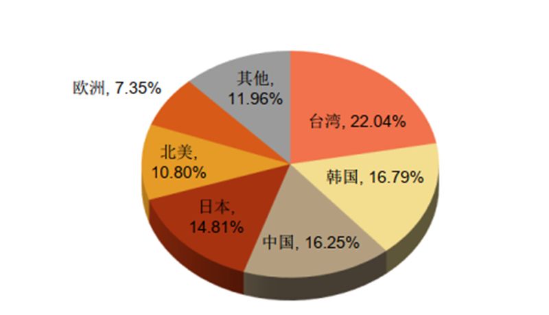 从全球国家和地区来说,中国台湾依然是半导体材料消耗最大的地区。2018 年中国台湾地区半导体销售额 114.5 亿美元,全球占比 22.04%。中国大陆占比 16.25%排名全球第三,略低于 16.79%的韩国。