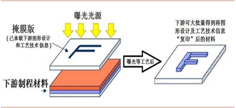 掩膜版(Photomask),又称光罩、光掩膜、光刻掩膜版、掩模版等,是下游行业产品制造过程中的图形“底片”,是承载图形设计和工艺技术等知识产权信息的载体。在光刻过程中,掩膜版是设计图形的载体。通过光刻,将掩膜版上的设计图形转移到光刻胶上,再经过刻蚀,将图形刻到衬底上,从而实现图形到硅片的转移。掩膜版是光刻过程中的重要部件,其性能的好坏对光刻有着重要影响。