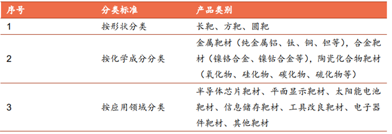 溅射靶材种类繁多,依据不同的分类标准,可以有不同的类别。溅射靶材可按形状分类、按化学成份分类以及按应用领域分类。
