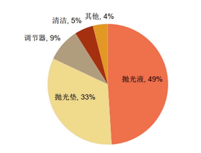 CMP 工艺过程用到的材料有抛光液、抛光垫、调节器等,其中抛光液和抛光垫是最核心的材料,占比分别为 49%和 33%。