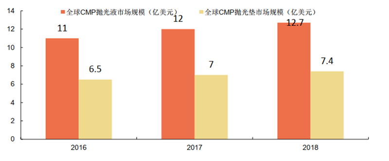 根据 Cabot Microelectronics 官网公开披露的资料,2016 年、2017 年和 2018 年全球化学机械抛光液市场规模分别为 11.0 亿美元、12 亿美元和 12.7 亿美元,预计2017-2020 年全球 CMP 抛光液材料市场规模年复合增长率为 6%。抛光垫方面,2016-2018 年全球化学机械抛光垫市场规模分别为 6.5 亿美元、7 亿美元和 7.4 亿美元。