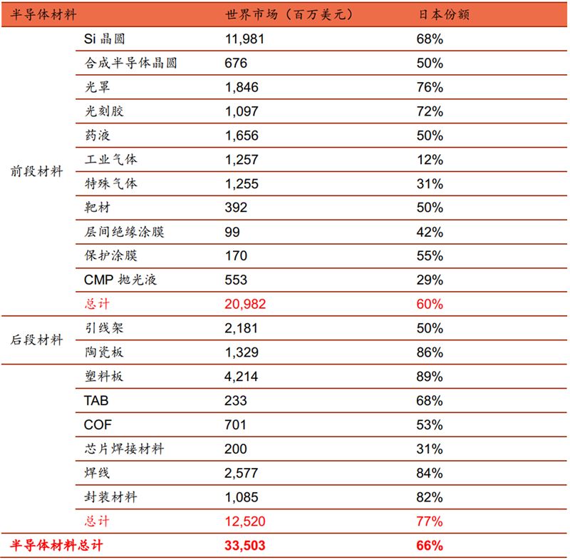 在半导体制造过程包含的 19 种核心材料中,日本市占率超过 50%份额的材料就占到了 14 种,在全球半导体材料领域处于绝对领先地位。