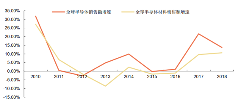 ▲全球半导体销售额增速与半导体材料销售额增速对比