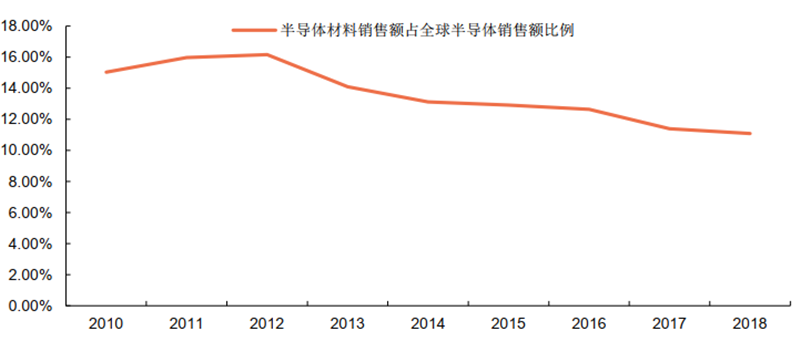 半导体材料销售额占全球半导体销售额比例在 2012 年达到峰值,占比超过 16%,近些年逐步下降,2018 年占比约 11%。占比下降的主要原因是 2013 年开始受益于存储市场的快速增长,半导体销售额增速开始回升,2013-2018 年半导体销售增速一直高于半导体材料销售增速。
