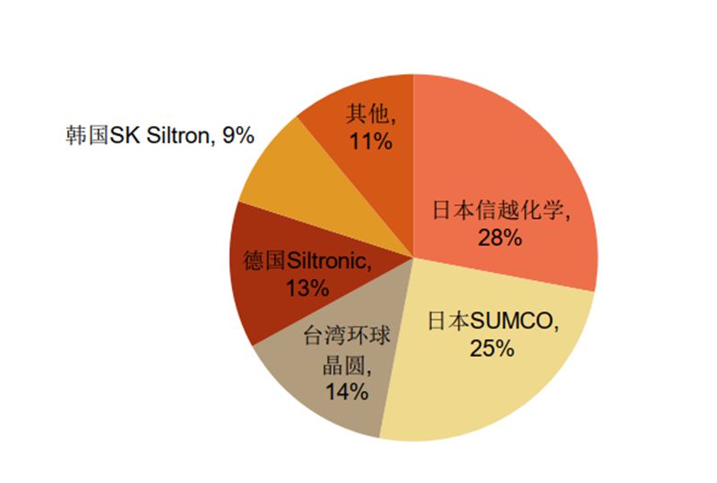 目前全球硅片市场处于寡头垄断局面。2018 年全球半导体硅片行业销售额前五名企业的市场份额分别为:日本信越化学 28%,日本 SUMCO 25%,中国台湾环球晶圆 14%,德国 Siltronic 13%,韩国 SK Siltron 9%,前五名的全球市场市占率接近 90%,市场集中度高。