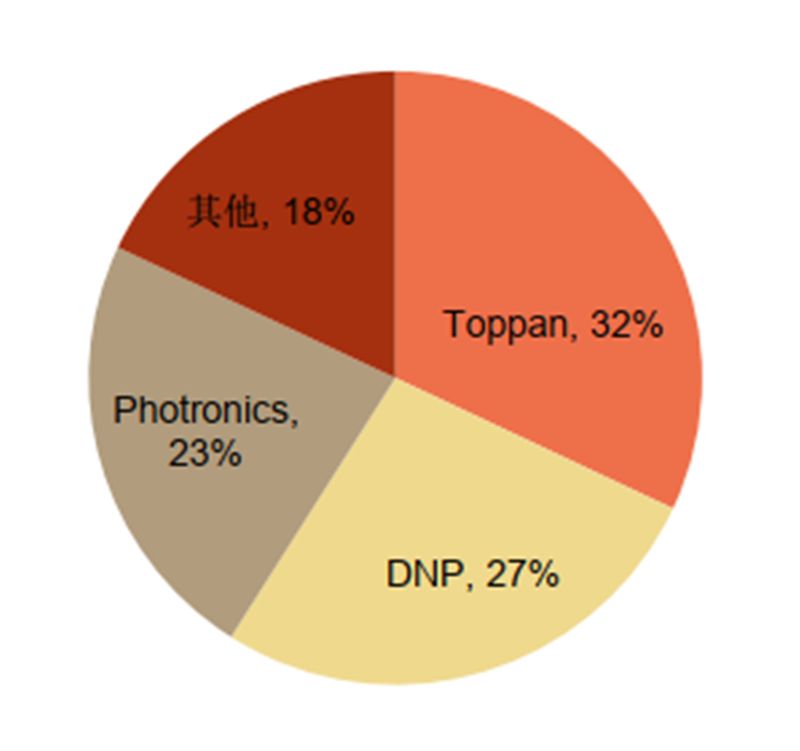 从生产商来看,目前全球掩膜版生产商主要集中在日本和美国的几个巨头,包括日本凸版印刷 TOPAN、日本大印刷,美国 Photronics,日本豪雅 HOYA,日本 SK电子等。其中Photronics、大日本印刷株式会社 DNP 和日本凸版印刷株式会社Toppan 三家占据全球掩膜版领域 80%以上市场份额。此外,晶圆制造厂也会采取自制方式对内提供掩膜版,如英特尔、台积电、三星等都有自制掩膜版业务。