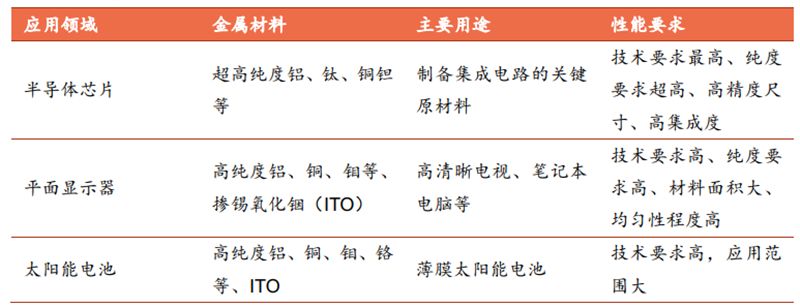 溅射靶材的应用领域广泛,由于应用领域不同,溅射靶材对金属材料的选择和性能要求都有所不同。其中,半导体芯片对靶材的技术要求最高,对金属的纯度、内部微观结构等都有极高的标准。