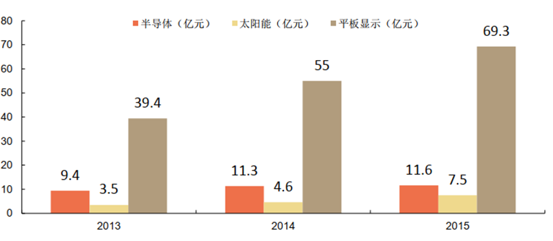 根据中国电子材料行业协会的统计,2016 年全球溅射靶材市场规模 113.6 亿美元,其中平板显示领域市场规模 38.1 亿美元,占比 33.54%,半导体领域市场规模 11.9亿,太阳能领域规模 23.4 亿美元。