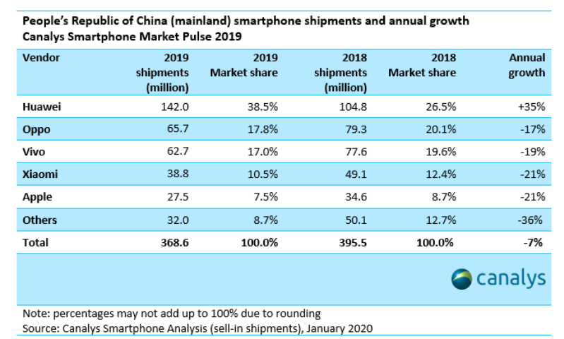 在国内市场中,华为以38.5%的市场份额占据头把交椅,是第二名、第三名市场份额的总和还多。并且在2019年全球手机市场衰退的大潮中逆势增长,华为国内市场出货量同比增长达到35.5%。