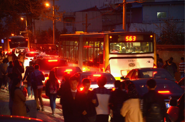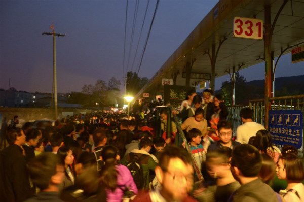已到傍晚,依然可以看到游客排长队在等待回家的公交车。