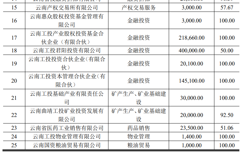 另外,云南工投直接持有南天信息(000948.SZ)35.38%的股份并通过全资子公司南天电子信息产业集团公司间接持有其0.78%的股份。同时,云南工投还直接持有沃森生物(300142.SZ)5.01%的股份。